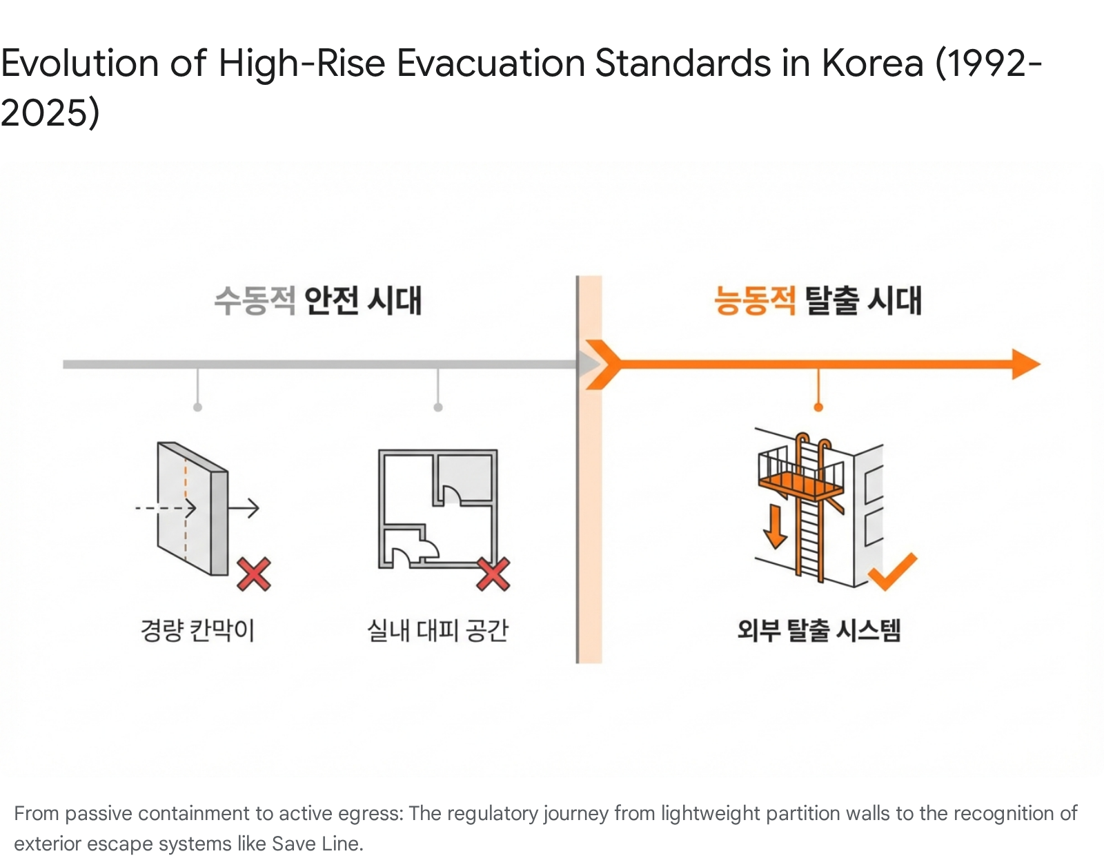 과거 수십 년간 한국의 건축 법규와 소방 안전 정책은 ‘수동적 방어(Passive Defense)’에 의존해 왔다. 이는 화재 발생 시 거주자가 특정 공간에 머무르며 구조대를 기다리는 ‘대피공간(Shelter)’ 중심의 전략이었다. 그러나 2010년대 이후 발생한 의정부 아파트 화재, 제천 스포츠센터 화재, 그리고 최근의 각종 물류센터 및 고층 주상복합 화재 사건들은 이러한 수동적 전략의 한계를 여실히 드러냈다. 유독 가스는 방화문을 뚫고 침투했으며, 골든타임 내에 외부 구조 장비(고가 사다리차 등)가 도달하지 못하는 경우가 빈번했다.