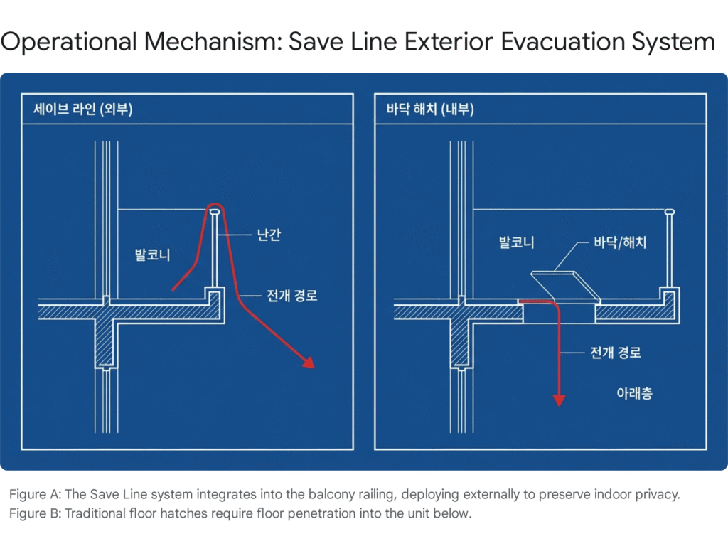 한국키네티코엔지니어링의 ‘세이브라인(Save Line)’은 ‘외부 돌출형/난간 일체형 탈출 시설’로 분류된다. 이는 경쟁 기술인 ‘하향식 피난구(내부 바닥 매립형)’와 근본적으로 다른 접근 방식을 취한다.