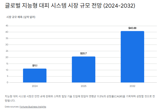 전 세계적으로 도시화와 고층화가 진행됨에 따라 ‘지능형 대피 시스템(Intelligent Evacuation System)’ 시장은 급성장하고 있다. 조사에 따르면 글로벌 지능형 대피 시스템 시장은 2024년 111억 달러에서 2032년 408억 8천만 달러 규모로 성장할 것으로 전망되며, 연평균 성장률(CAGR)은 11.5%에 달한다. 한국 시장 역시 소방 산업 수요 조사에 따르면 매년 꾸준한 성장세를 보이고 있다.
